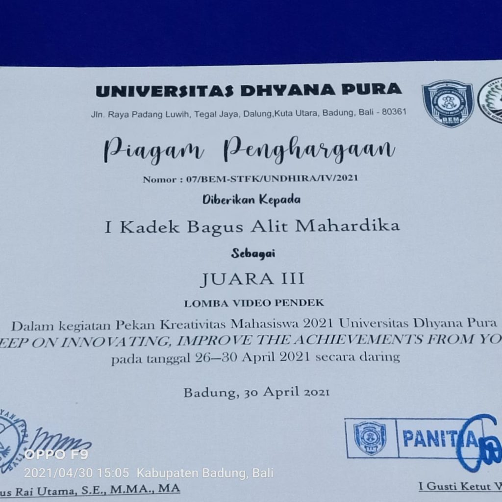 P.S Pendidikan Vokasi Kesejahteraan KeluargaNews Mahasiswa Program Studi Pendidikan Kesejahteraan Keluarga a/n I Kadek Bagus Alit Mahardika Meraih JUARA 3 Lomba Video Pendek, dalam Pekan Kreativitas Mahasiswa pada tanggal 30 April 2021